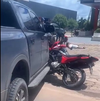 Com o impacto, a motocicleta ficou presa sob a parte frontal da caminhonete, e o condutor foi arremessado ao solo, apresentando ferimentos graves e perda considerável de sangue.