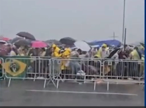 Em vídeos que circulam nas redes sociais, é possível ouvir o exato momento do estralo e ver o clarão da descarga elétrica. No vídeo, os manifestantes aparecem aglomerados sob guarda-chuvas e tendas quando são surpreendidos pelo raio. O impacto causou correria e gritos entre os presentes.