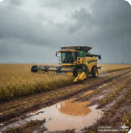 NOVA BANDEIRANTES – O setor agrícola de Nova Bandeirantes vive dias de tensão com a persistência de chuvas volumosas no final deste mês de janeiro. No auge da colheita da safra de soja 2025/26, os produtores rurais travam uma batalha contra o tempo e a umidade excessiva, que ameaça a qualidade dos grãos e dificulta o tráfego das colheitadeiras nas lavouras.