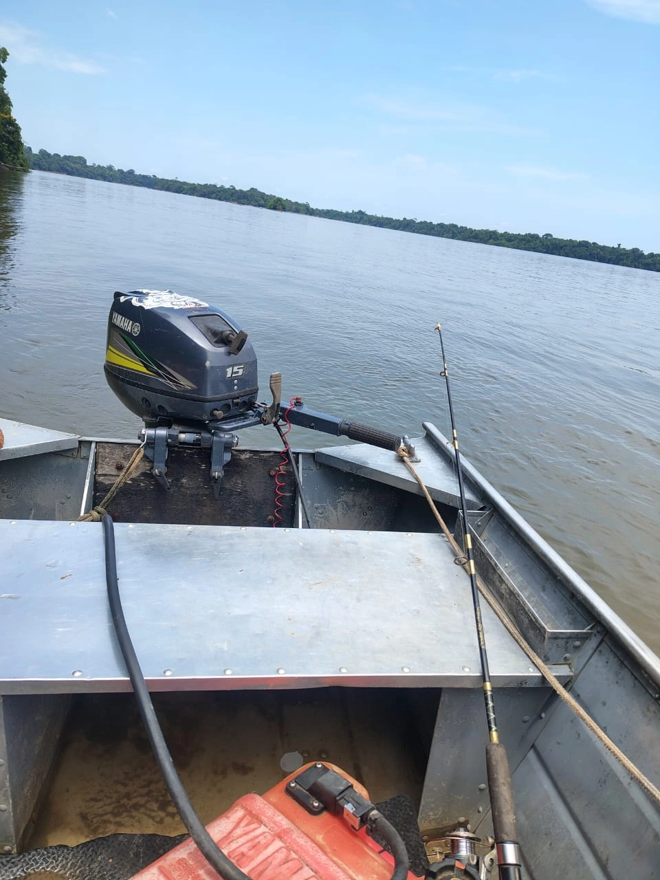 Um barco equipado com um motor Yamaha 15 HP.