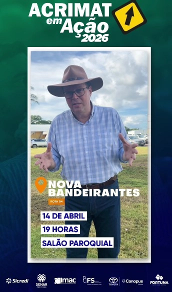 Nova Bandeirantes, MT – O município de Nova Bandeirantes se prepara para receber, nesta terça-feira, 14 de abril, uma das etapas regionais do renomado programa Acrimat em Ação 2026. O encontro acontecerá no Salão Paroquial, a partir das 19h, e promete reunir pecuaristas, lideranças do setor e profissionais do agronegócio.
