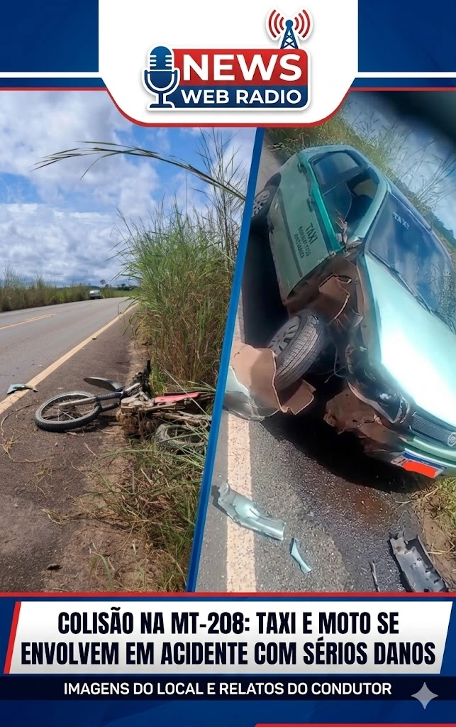 NOVA BANDEIRANTES | MT – Um grave acidente de trânsito foi registrado na manhã desta sexta-feira (24), na rodovia MT-208, envolvendo um táxi que atua no município de Nova Bandeirantes e uma motocicleta. O condutor do veículo, conhecido como Adile Soares, divulgou imagens do local logo após a colisão, relatando os momentos de tensão e o prejuízo sofrido.